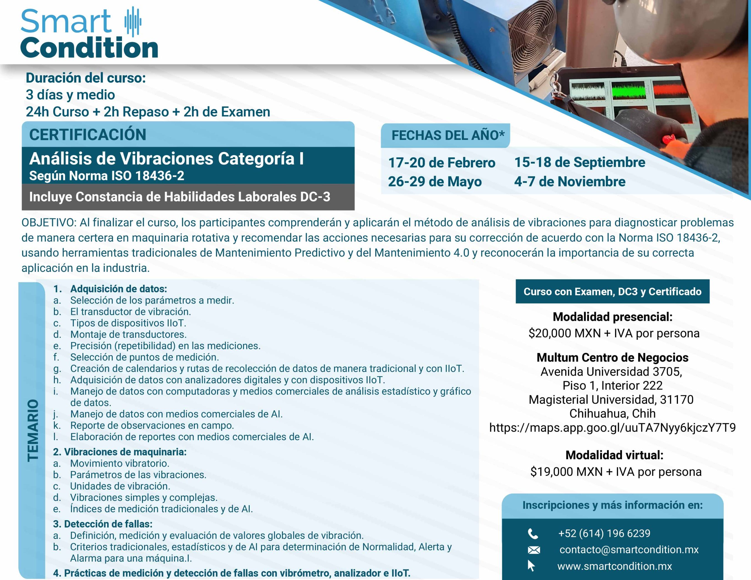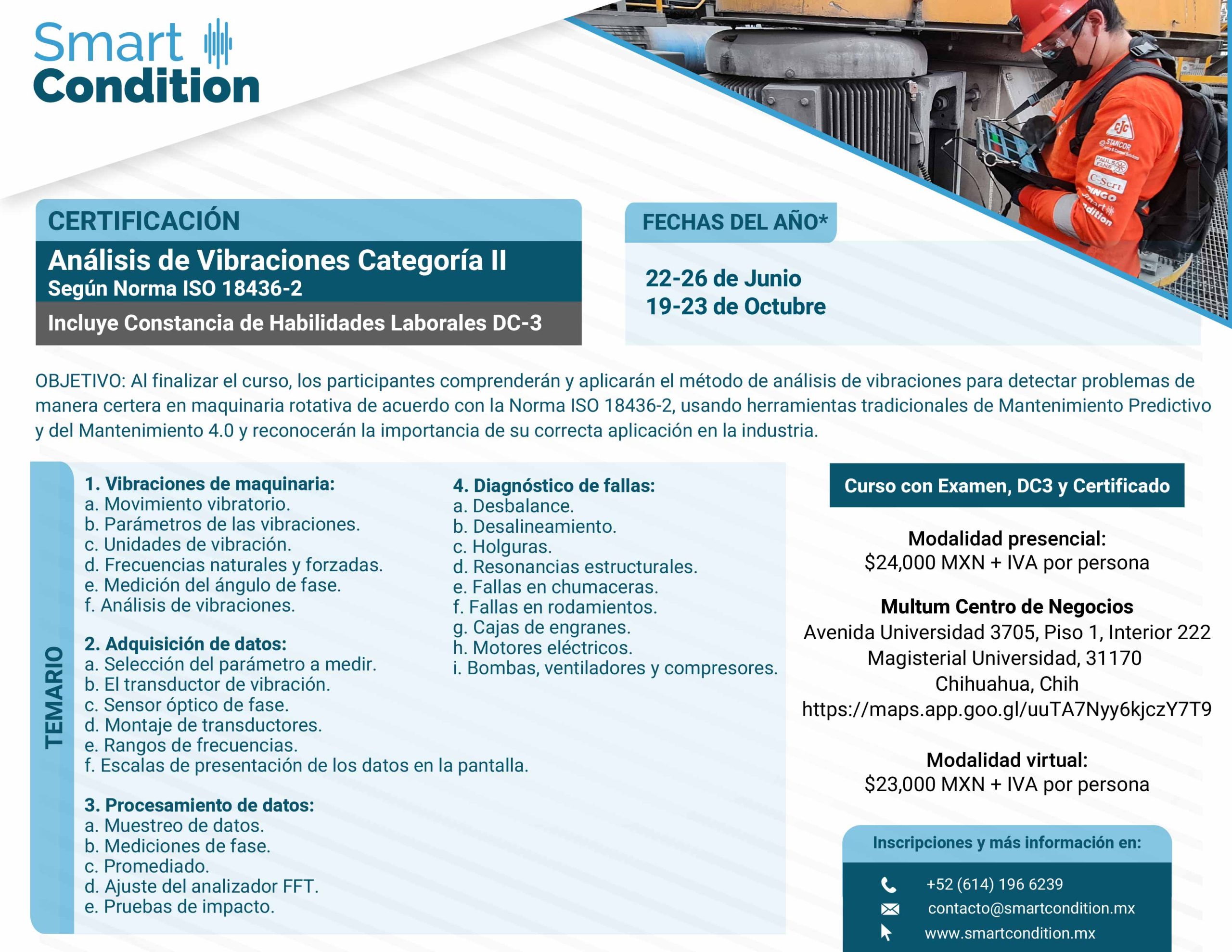 Un certificado de declaración de conformidad con los requerimientos de la ISO 18436-2:2014, de acuerdo con ISO 18436-1, provee reconocimiento y evidencia de que los individuos están habilitados para desarrollar mediciones de vibración y análisis para monitoreo de condición de maquinaria y diagnóstico usando equipo de medición de vibraciones. Un área particularmente importante hacia la cual se orienta este curso es el empleo de herramientas del Internet Industrial de las Cosas (IIoT), el uso de grandes cantidades de datos y del análisis estadístico y la Inteligencia Artificial (AI) básicas para la predicción de fallas en maquinaria industrial.
