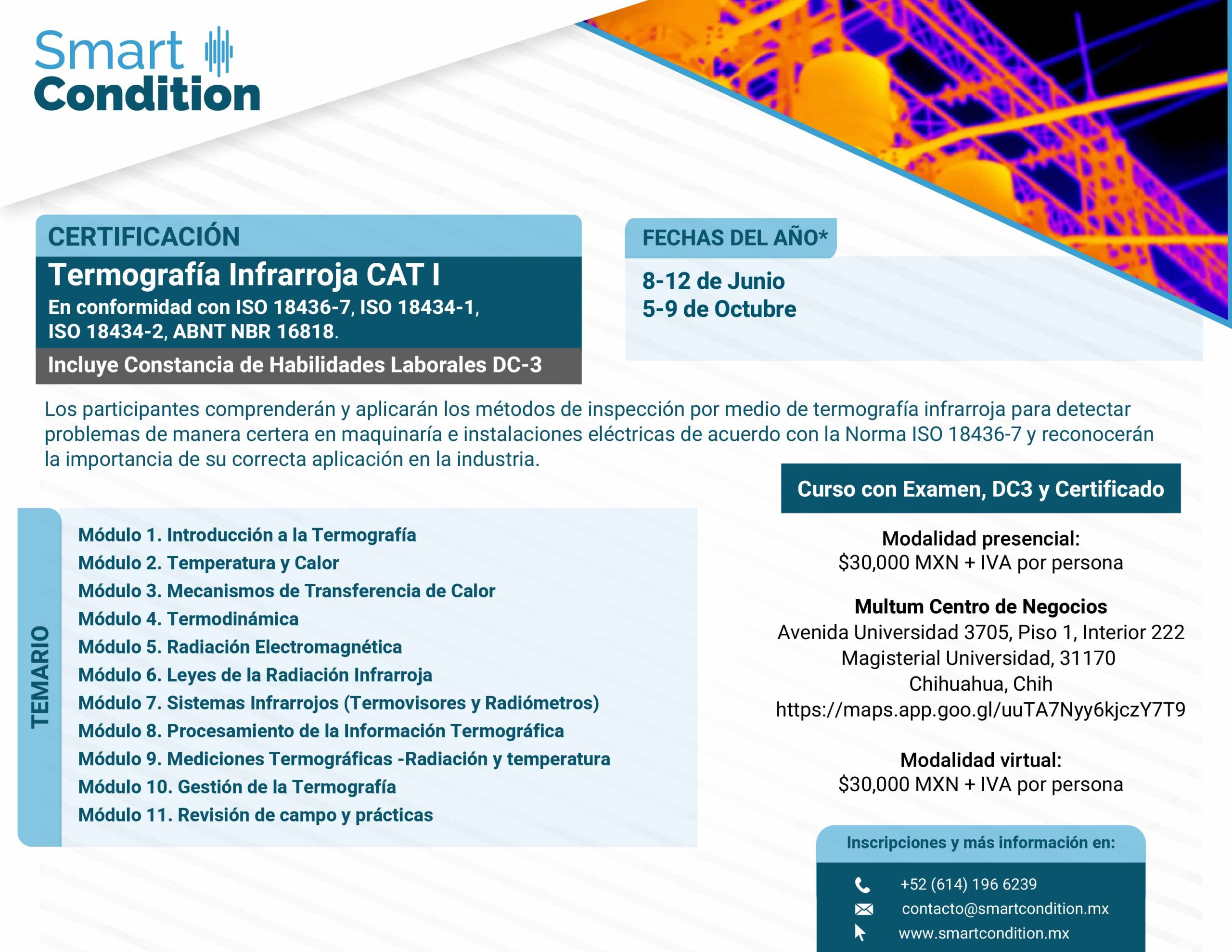 Al finalizar el curso, los participantes comprenderán y aplicarán los métodos de inspección por medio de termografía infrarroja para detectar problemas de manera certera en maquinaría e instalaciones eléctricas de acuerdo con la Norma ISO 18436-7 y reconocerán la importancia de su correcta aplicación en la industria.